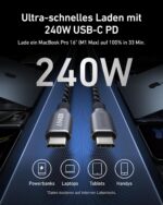 Schnell, zuverlässig, nachhaltig: Erlebe ultra-schnelles Laden mit unserem nachhaltigen 240W-Ladekabel aus recyceltem Nylon. Es bietet eine rasche Datenübertragung und bleibt auch bei extremen Temperaturen von -40°C bis 80°C funktionsfähig.