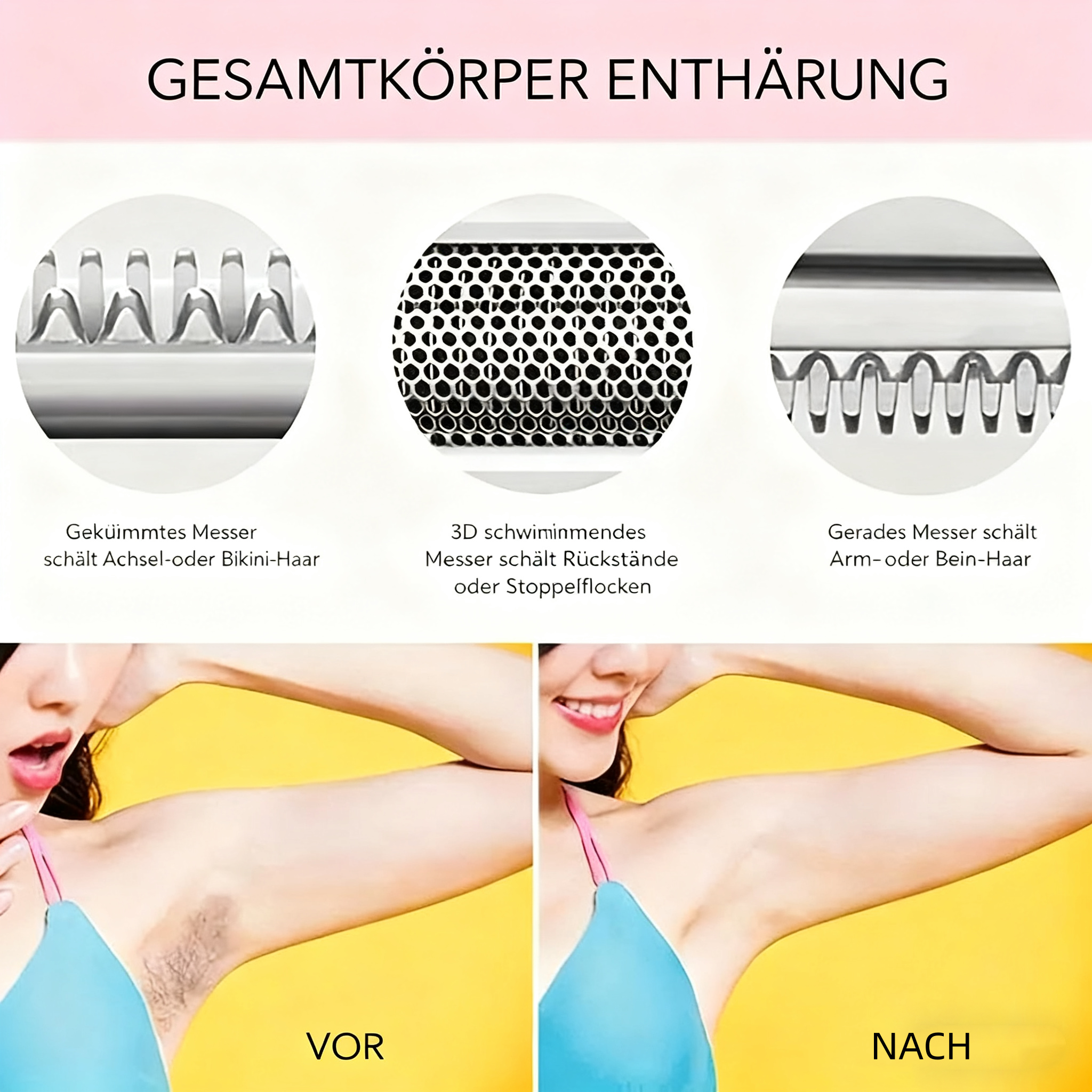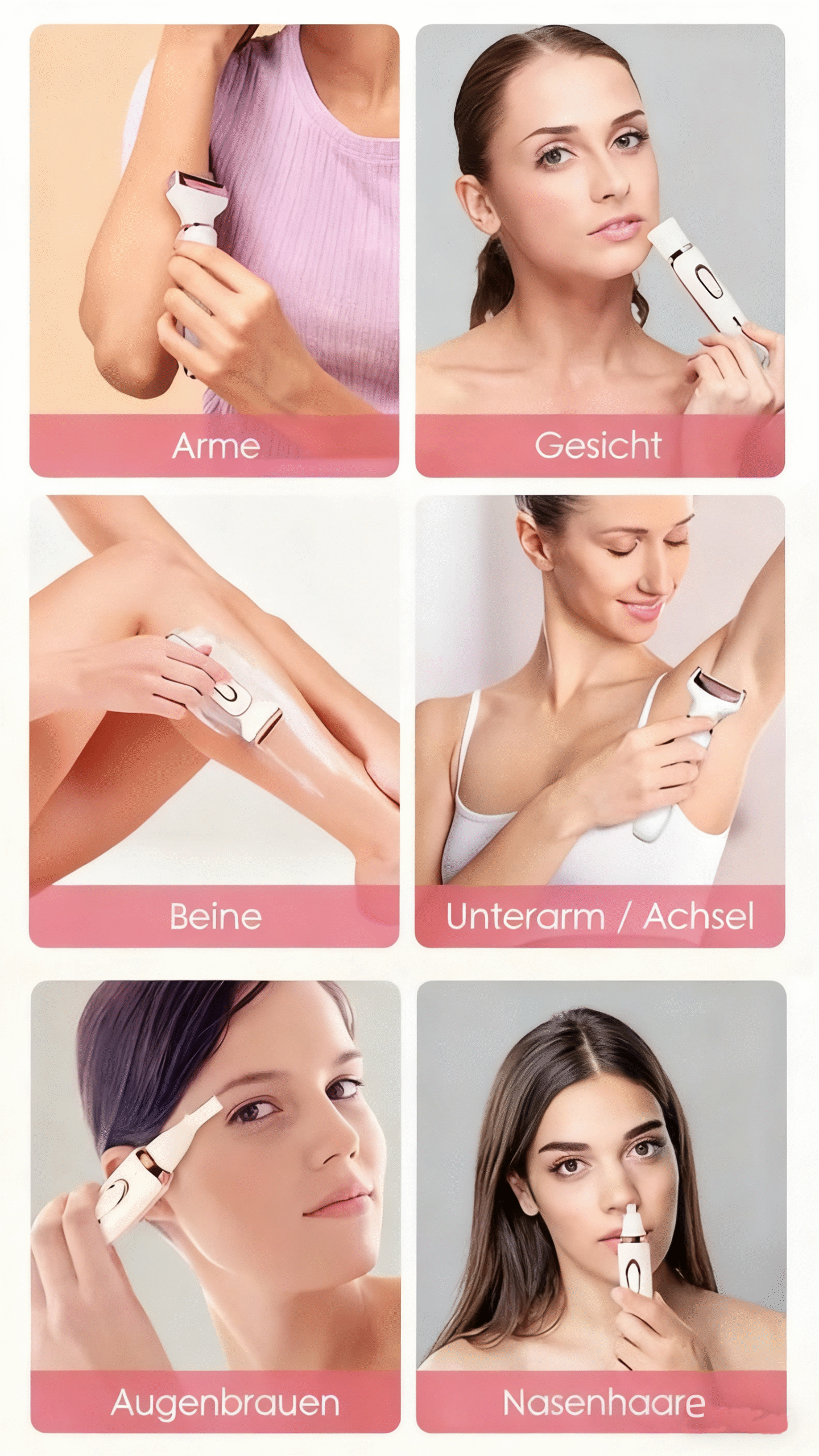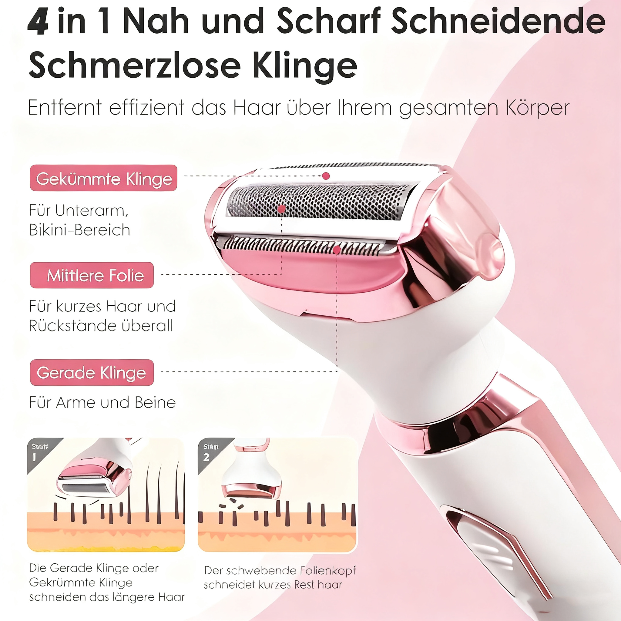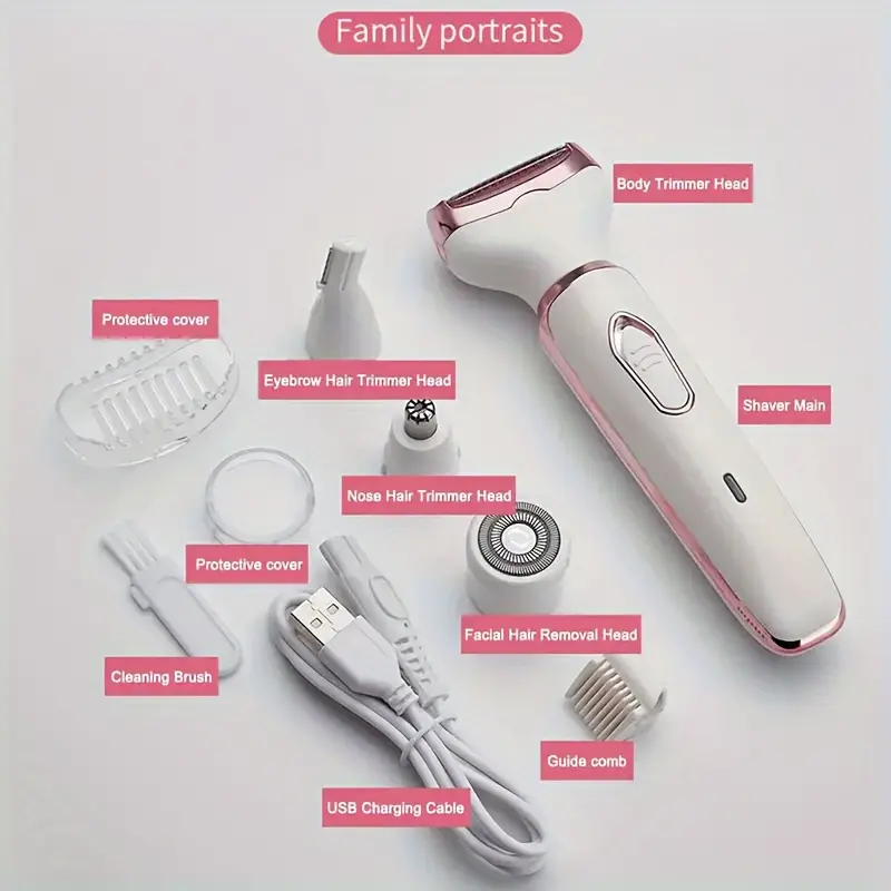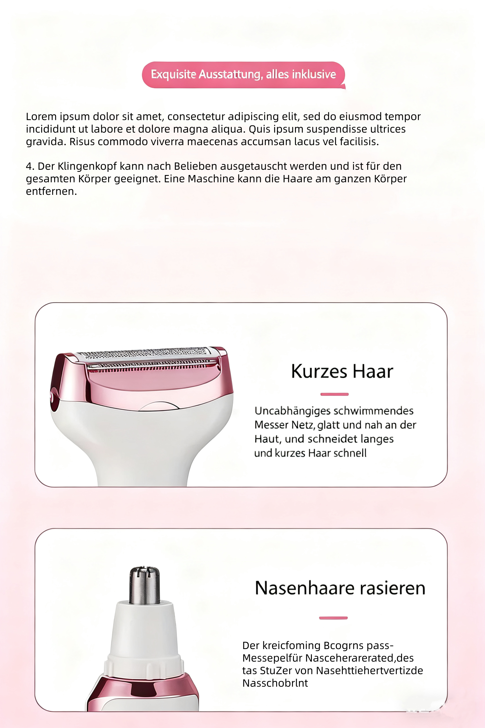 4-in-1 Multifunktionaler Haarentferner für Frauen Dieser 4-in-1 Multifunktions-Haarentferner für Frauen ist ein elektrischer Rasierer, der Praktikabilität und Portabilität vereint und speziell für die Bedürfnisse des Ganzkörperhaarensatzes bei Frauen entwickelt wurde, während er Sicherheit, Komfort und Vielseitigkeit gewährleistet