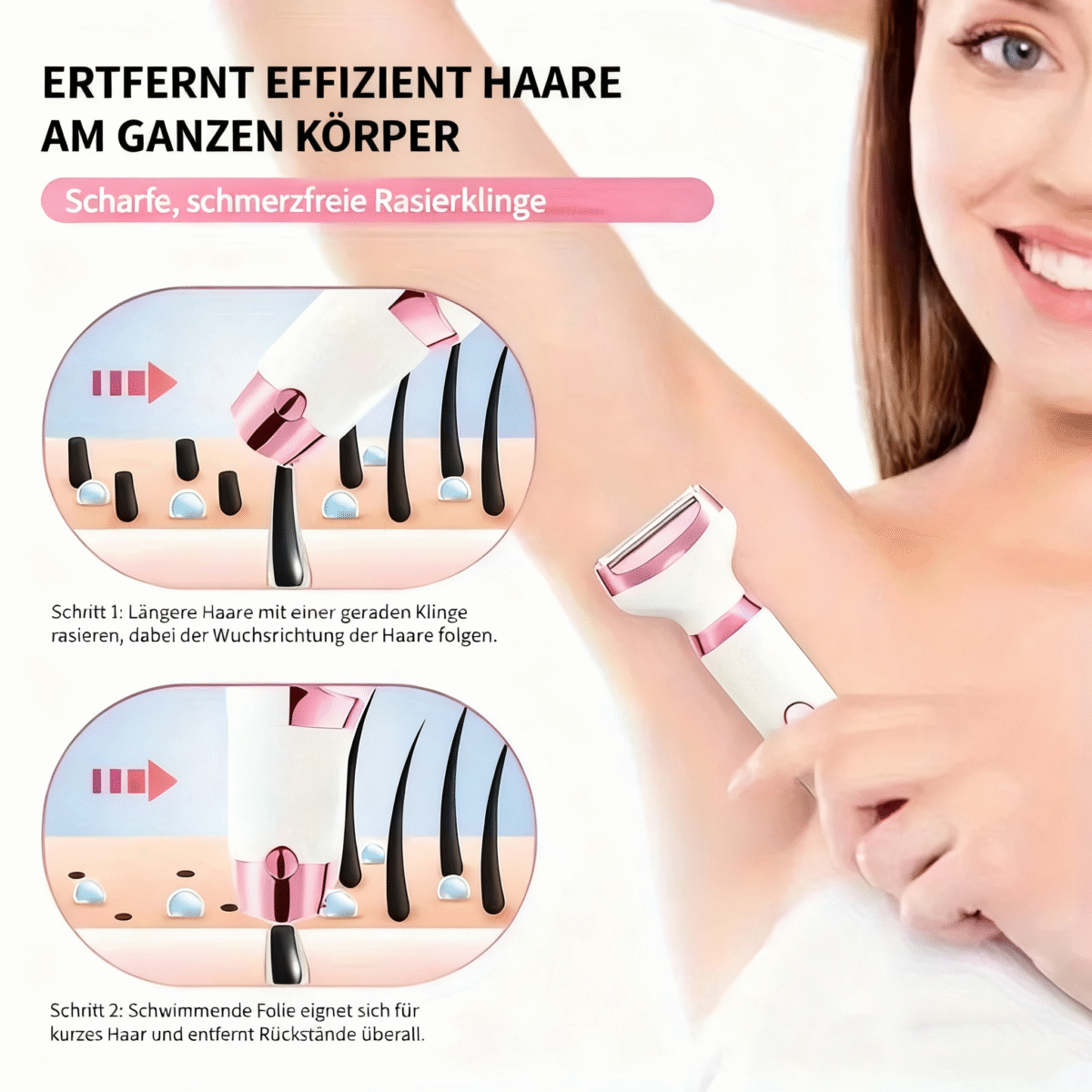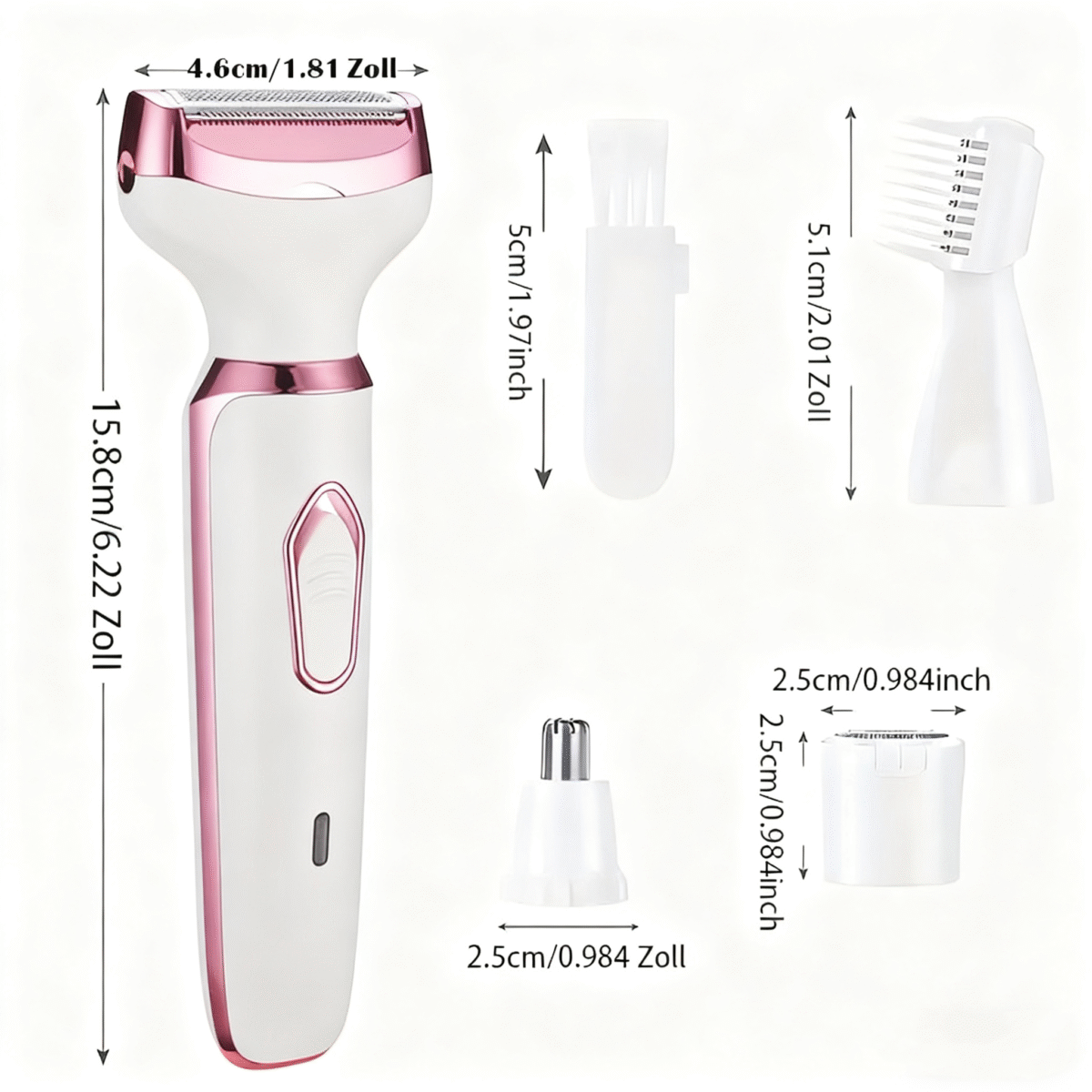 4-in-1 Multifunktionaler Haarentferner für Frauen Dieser 4-in-1 Multifunktions-Haarentferner für Frauen ist ein elektrischer Rasierer, der Praktikabilität und Portabilität vereint und speziell für die Bedürfnisse des Ganzkörperhaarensatzes bei Frauen entwickelt wurde, während er Sicherheit, Komfort und Vielseitigkeit gewährleistet