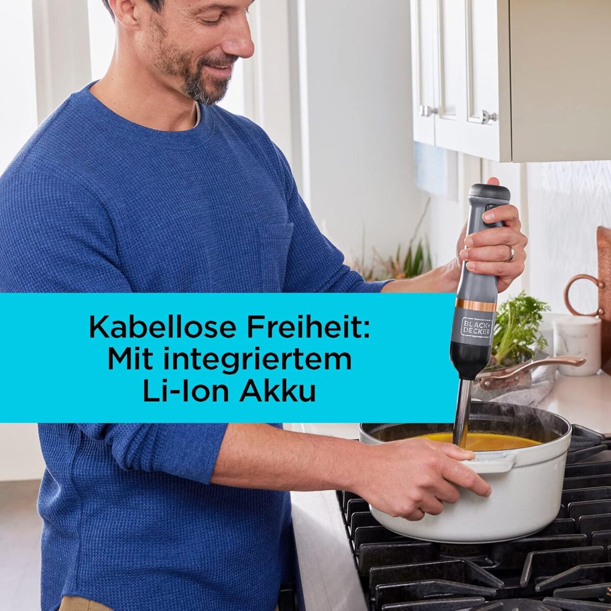 • Kabellose Freiheit: Der BLACK+DECKER Stabmixer bietet kabellose Freiheit durch den integrierten Lithium-Ionen-Akku, der eine anhaltende Leistung von bis zu 24 Minuten ermöglicht