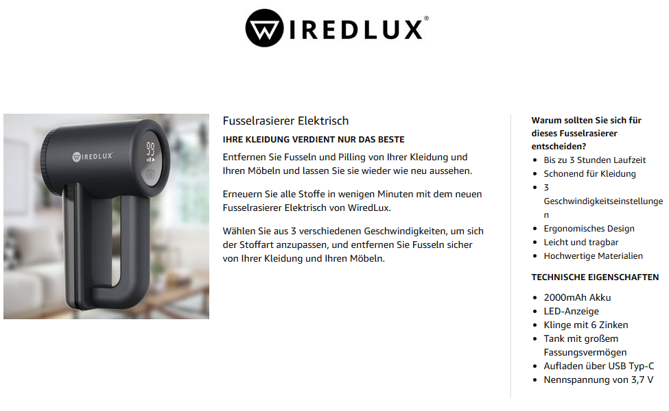 Schreiben Sie die erste Rezension für „Fusselrasierer Elektrisch WiredLux – Wiederaufladbarer Fusselentferner für Kleidung & Möbel – Einstellbare 3-Fach Geschwindigkeit, 6-blättrige Klinge, LED-Anzeige, USB-Aufladung (Schwarz)“