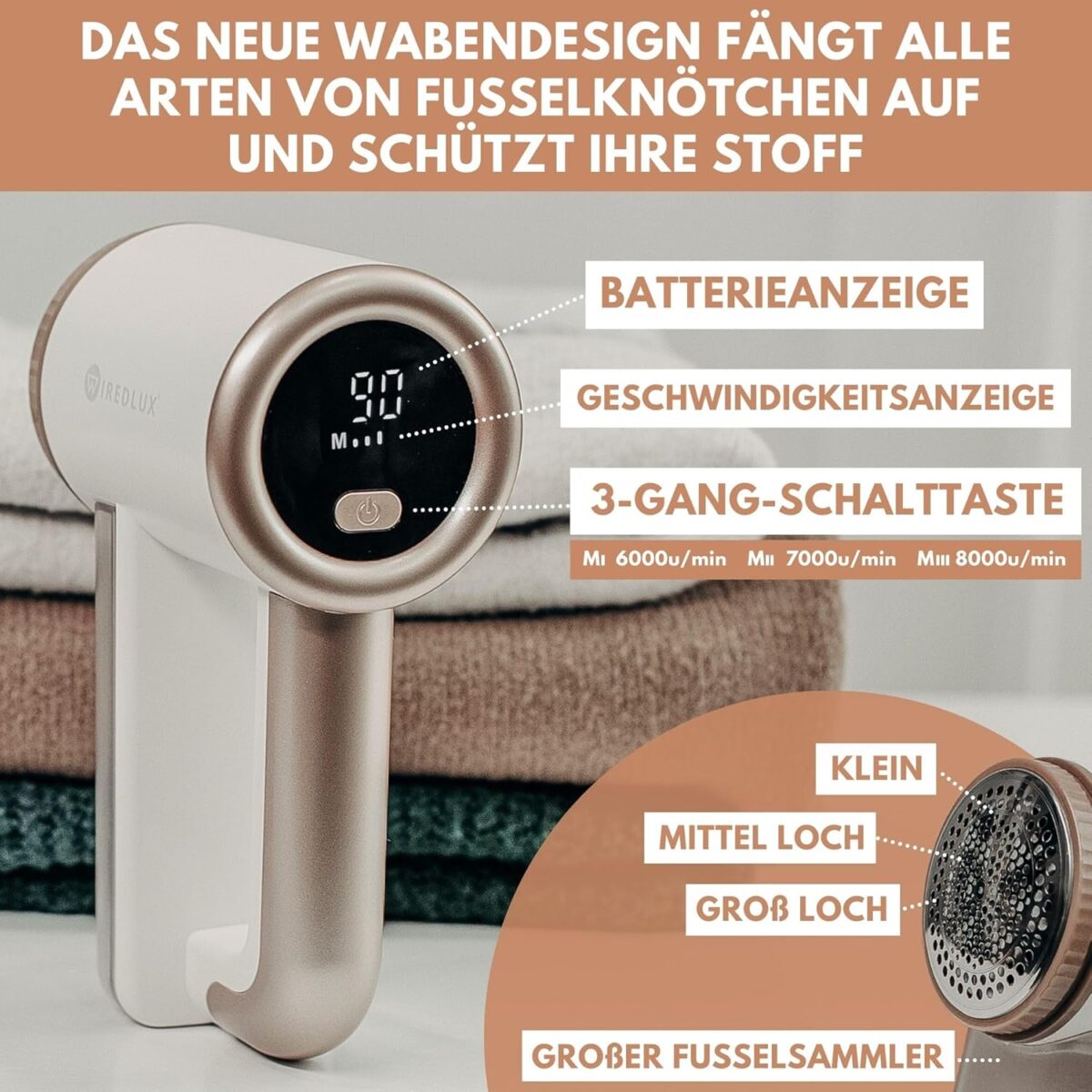 Fusselrasierer Elektrisch WiredLux – Wiederaufladbarer Fusselentferner für Kleidung & Möbel – Einstellbare 3-Fach Geschwindigkeit, 6-blättrige Klinge, LED-Anzeige, USB-Aufladung (Schwarz)