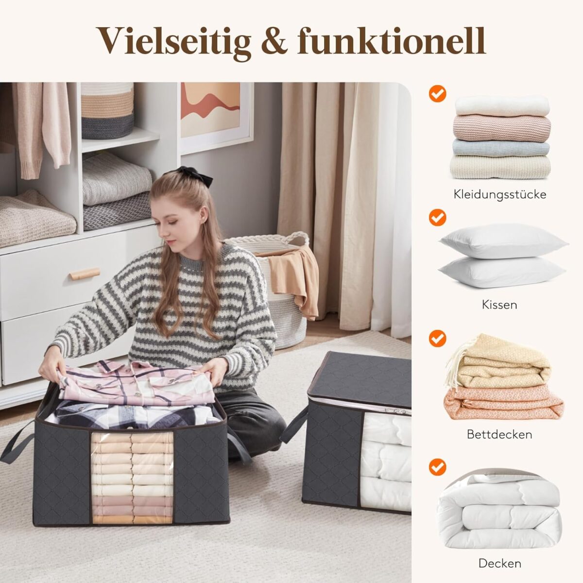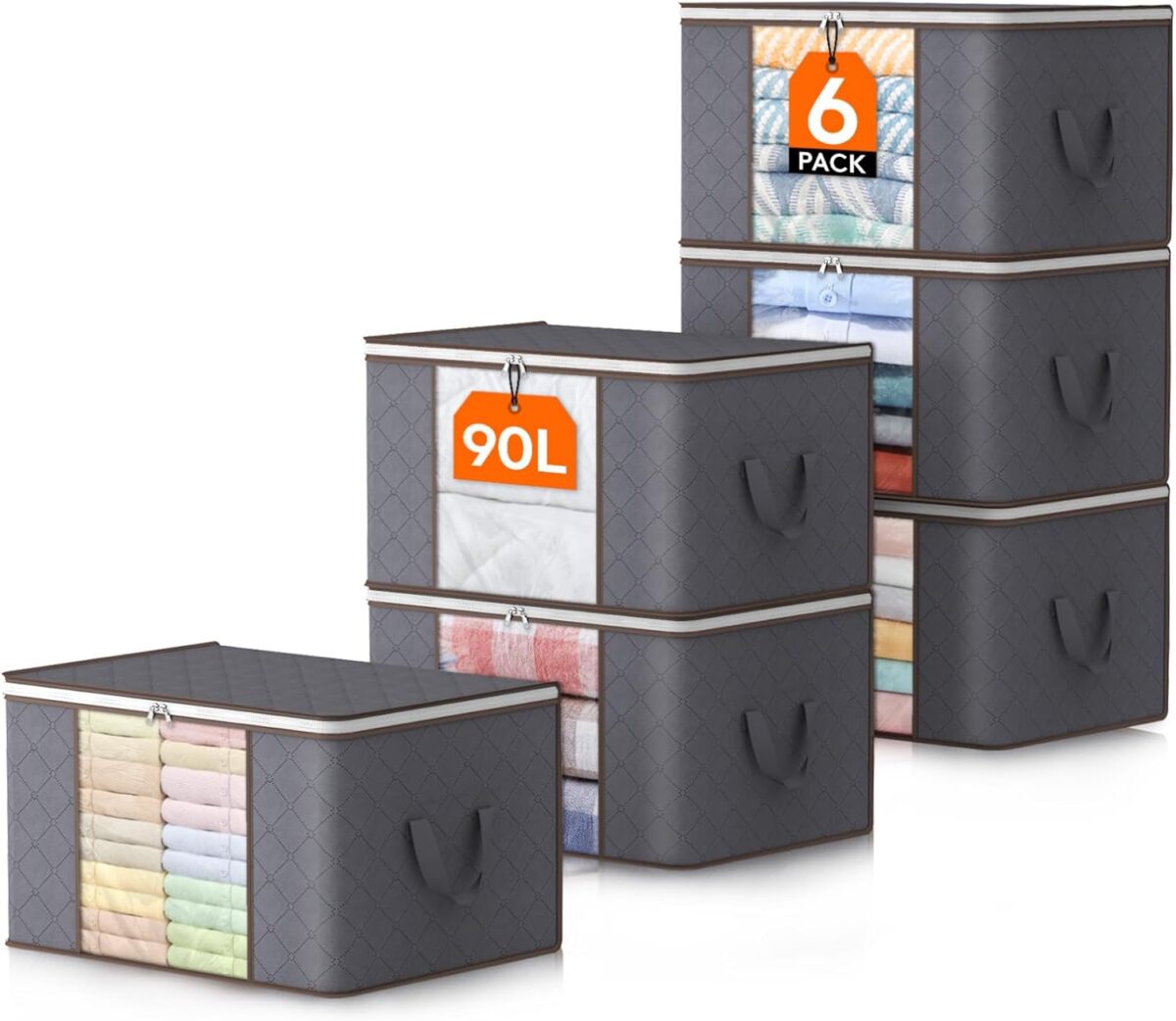 Lifewit 6 Stück 90L Aufbewahrungstasche, Aufbewahrungsbox mit Deckel, Groß Kleideraufbewahrung Umzugskartons, Faltbare Aufbewahrung Boxen für Bettdecken Decken Kleidung Unterbett Kleiderschrank, Grau
