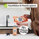 Interessant zu wissen: Sie sind in einer Flasche aus recyceltem Plastik verpackt. Flasche leer? Verwenden Sie einen Nachfüller und sparen Sie 79% Plastik! Sparen Sie Geld und reduzieren Sie Abfall.