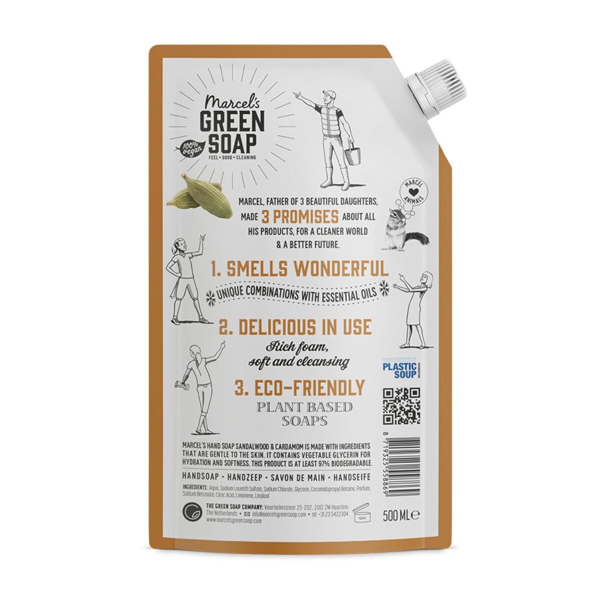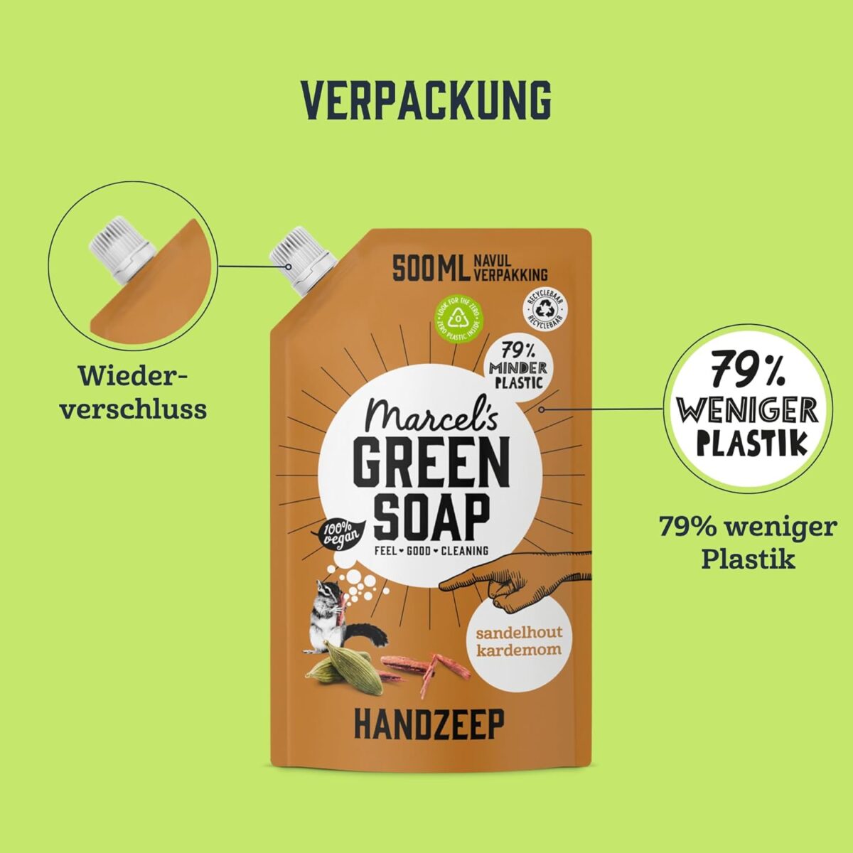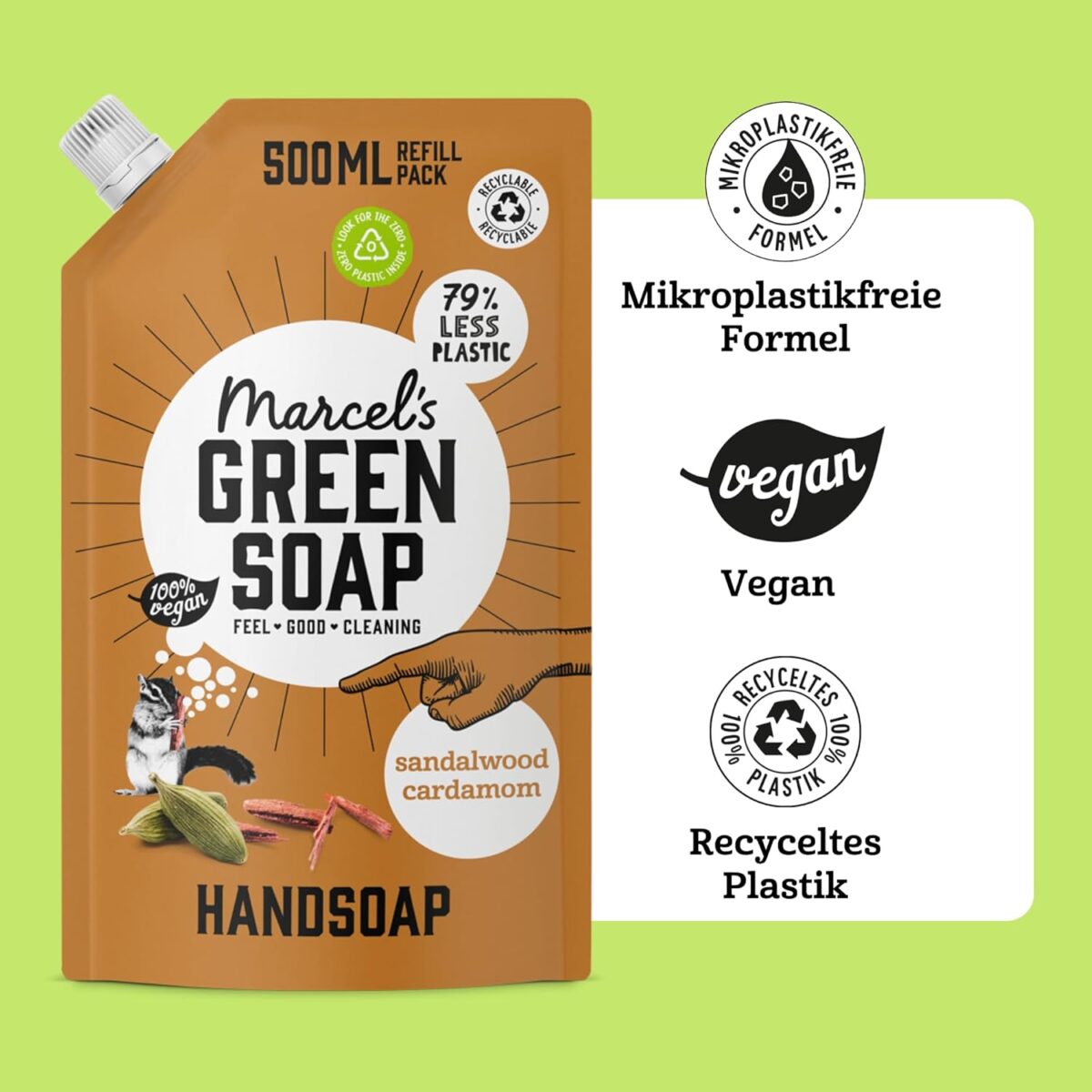 Marcel’s Green Soap – Handseife Nachfüllpack Sandelholz & Kardamom – Flüssigseife Spender Nachfüllpack – Umweltfreundlich – Vegan – 97% Biologisch abbaubar – 500 ml