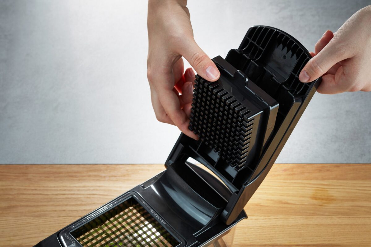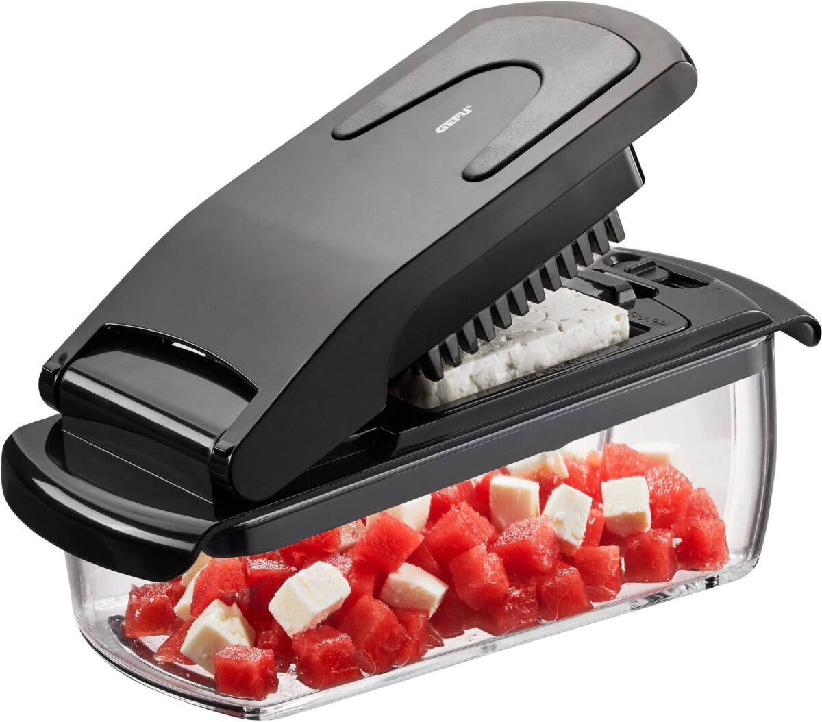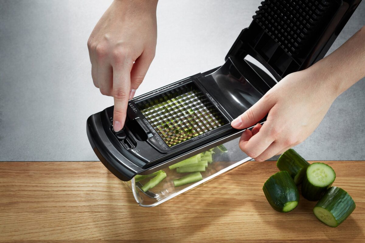 Schneller und bequemer kann man Obst und Gemüse nicht in bunte Würfel und vielseitig verwendbare Stifte verwandeln. Extrascharfe Messereinsätze sorgen für müheloses Schneiden und gleichmäßige Resultate – von fein für gesunde Rohkost oder Suppeneinlagen bis grob für Pommes Frites oder leckere Eintöpfe. Perfekt auch zum Würfeln von Fetakäse.