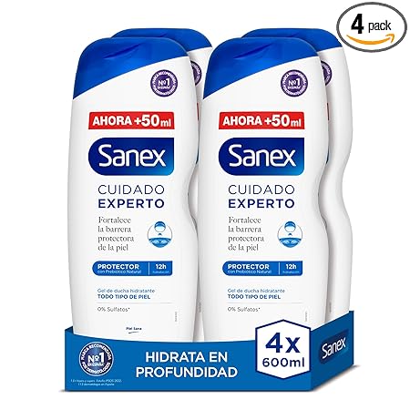 Sanex Duschgel, Expertenpflege, 4 Stück x 600 ml, Formel mit natürlichem Präbiotikum, stärkt die Schutzbarriere der Haut, 12H Feuchtigkeit, 0% Sulfate, für alle Hauttypen