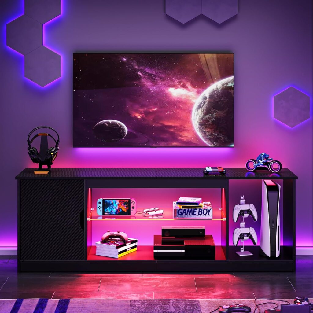 Bestier TV-Schrank 145x35x52 cm für Fernseher bis 65 Zoll mit RGB LED-Beleuchtung (22 Farben) & verstellbaren Glasböden – Lowboard für Wohnzimmer, Schlafzimmer (Schwarze Kohlefaser)